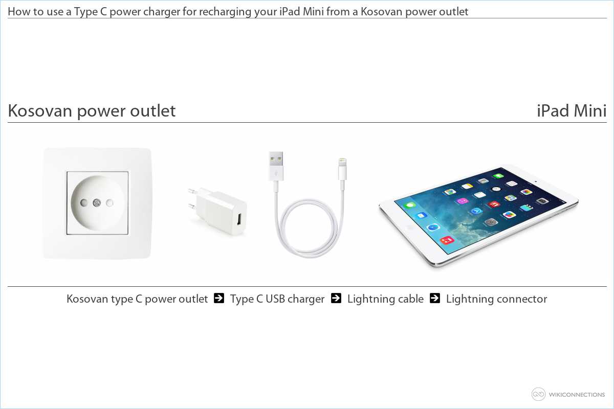- In order to charge the iPad Mini using the Kosovan power outlet you'll need a Type C USB power plug adapter [4] and a USB to Apple Lightning cable [5] - the cable is normally supplied with the device.