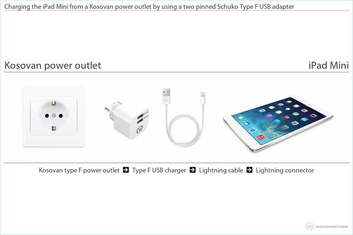 - To power the iPad Mini from a Kosovan power outlet you will need to use a Type F USB power plug adapter [7] and a USB to Apple Lightning cable [5] (Apple typically supply this USB cable when you purchase your iPad Mini).